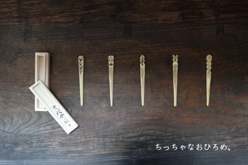 煤竹の菓子楊枝(菓子切)は 表具裂(表具師 磯さん)の菓子楊枝入れに入っております。
