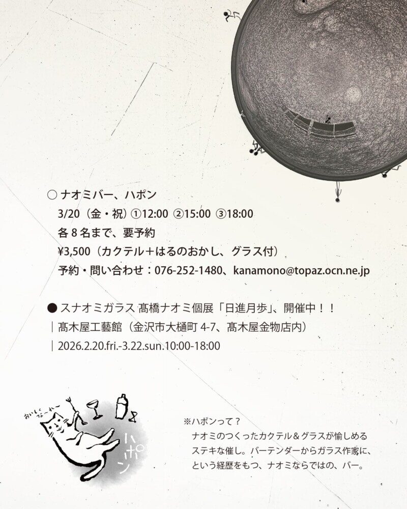 料:¥3,500(カクテル+はるのおかし+グラス付) 髙橋ナオミさんのカクテルを季節のおかし(吉はし製)ともに、ナオミグラスで飲み、そのグラスをお持ち帰りいだだくと~素敵なハポンイベントです。